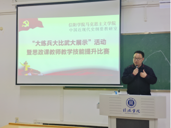 3月18日下午,中国近现代史纲要教研室在人文楼317教室进行了信阳学院思想政治理论课“大练兵”暨思想政治课教师教学技能提升比赛,共有13位青年教师参加了此次比赛。由马帮敏教授、陈华林副教授、张俊忠副教授担当此次比赛的评委,执行院长朱新荣莅临现场观摩比赛。大赛由张俊忠主持。