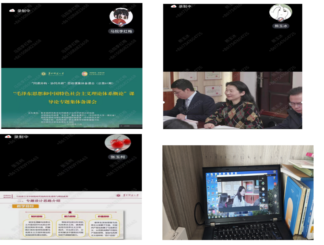 毛泽东思想和中国特色社会主义理论体系概论教研室组织学期初集体备课会,备课会分为两个阶段。第一阶段:全体教师在3月2日参加了由教育部师范教育提质计划华中师范大学组团、全国高校思政课“手拉手”集体备课中心(华中师范大学—湖北省)、高校思想政治理论课程群虚拟教研室(华中师范大学)、“同课异构·协同共研”思政课教学创新联盟秘书处、华中师范大学马克思主义学院通过教育部“虚拟教研室”客户端举办“同课异构·协同共研”“毛泽东思想和中国特色社会主义理论体系概论”课线上集体备课会。本次线上备课会分为教学分享和专家指导两个环节。在教学分享环节,周莉莉副教授从“教学内容与对象”“专题设计思路”“具体教学过程”三个方面对于自己的备课思路进行了分享,并在此之上基于第一周的教学实践进行了反思。在专家指导环节,华倩教授提出应当以“概论”课的课程定位为教学出发点,明确教学目标和章节定位,整合章节中一系列逻辑,抓住课程的重点和难点,不断进行教学思考和反思,不断地锤炼自己赶考本领,实现思政课的时代化,使学生在思政课中受益。