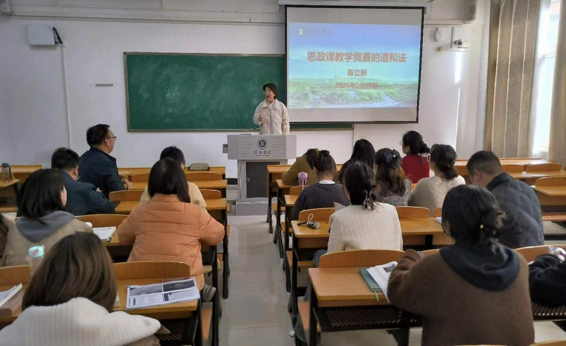 (二)中国近现代史纲要教研室在人文楼413教室举行教研活动。陈立新应邀作了“思政课教学竞赛的道与法”主题报告。她结合自身经历勉励大家践行弘扬教育家精神,加强师德修养,知不足而后进,望山远而力行,坚守师者匠心,勇担育人使命;她围绕学校第十六届青年教师课堂教学创新大赛要求从教学主题、开端、主线、文案和展示五个方面分享了参赛教学设计的方法,使大家茅塞顿开、收获颇丰。