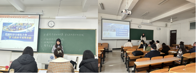 第一个环节,由魏雅君、余雅楠两位老师就第八讲《把握经济全球化大势,扩大高水平对外开放》这一章节的内容,深入浅出地阐述了她们的教学思路。魏雅君老师以视频“两个博主挑战只用本国国货的一天”为导入,分析说明,指出当前经济全球化发展过程中可能存在的困难与挑战以及中国在顺应经济全球化发展大势中展现中国智慧。最后,提出问题引导同学们对经济全球化进行深入思考。