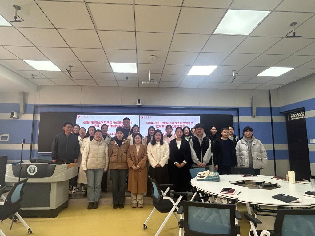 信阳学院马克思主义学院和信阳科技职业学院马克思主义学院为落实结对共建,促进校际交流合作,整合教育资源,提升教师教学水平,3月18日下午,形势与政策教研室在人文楼智慧教室101、毛泽东思想和中国特色社会主义理论体系概论教研室在人文楼智慧教室103分别开展了第一次集体备课活动。