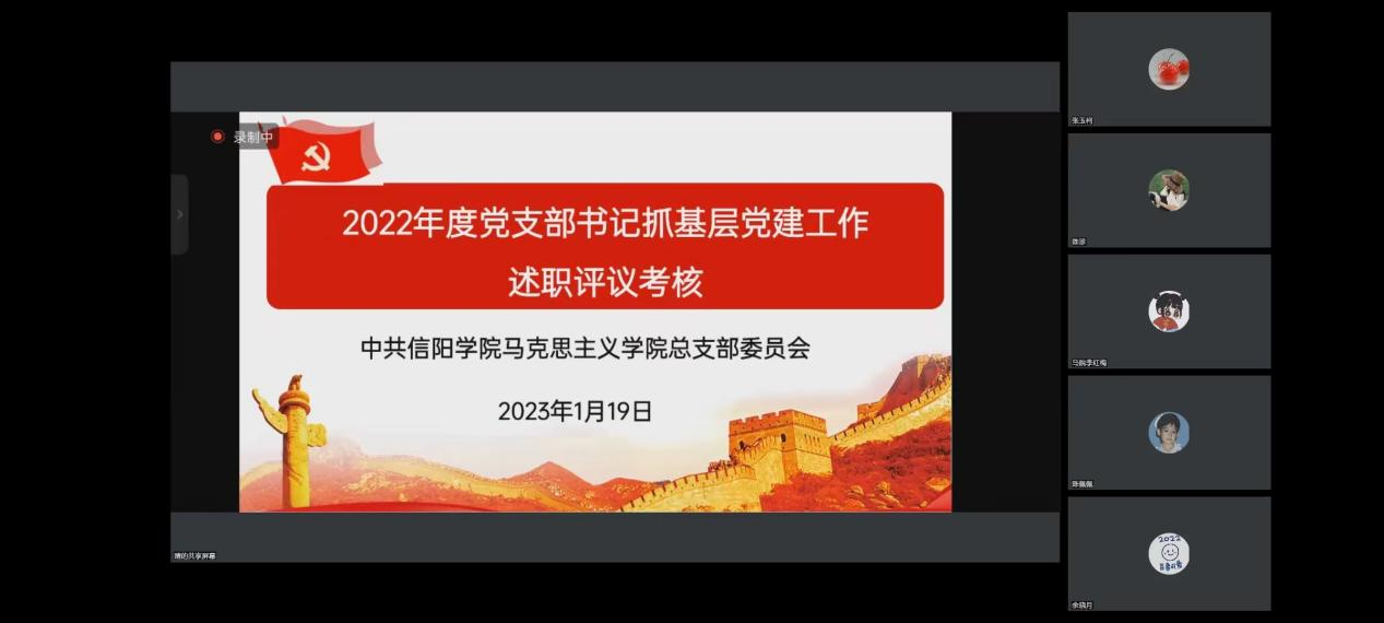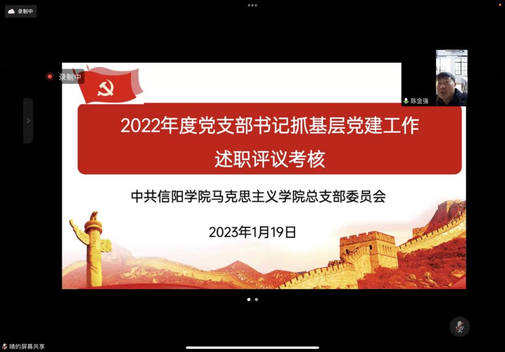 为深入贯彻落实党的二十大精神,根据党委工作安排及学院实际情况。1月19日下午,马克思主义学院党总支召开线上党支部书记抓基层党建述职评议考核会。院党总支委员、各支部书记、教师代表参加并担任评委。会议由院党总支副书记陈金强主持。