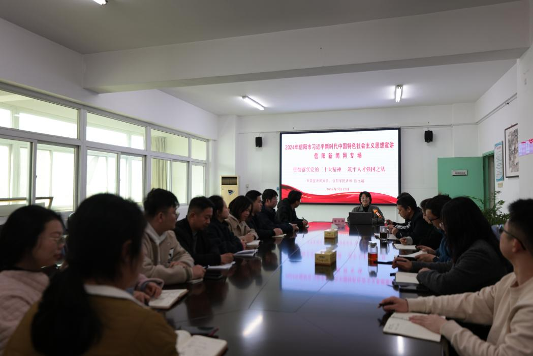 2024年3月12日,市委宣讲团成员、我院青年教师陈立新应邀到信阳日报社-信阳新闻网为全体党员开展习近平新时代中国特色社会主义思想宣讲活动。信阳新闻网主任张泽元以及全体党员参加了活动。