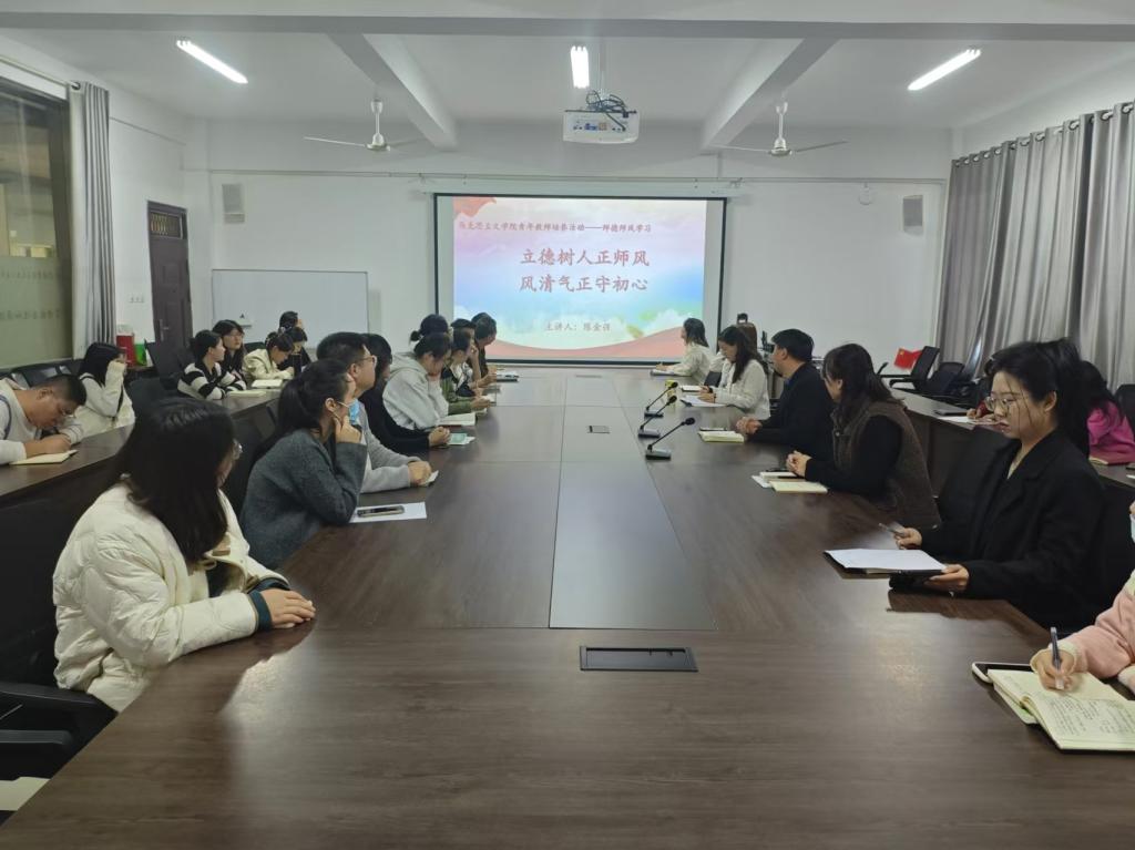 11月5日下午,马克思主义学院在人文楼南412会议室举行青年教师培养活动之师德师风专题学习,院党总支副书记陈金强以《立德树人正师风 风清气正守初心》为题作师德师风专题辅导,青年教师20余人参加学习,活动由执行院长朱新荣主持。