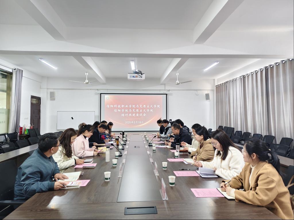 为深入贯彻落实习近平总书记关于思政课建设重要指示批示和新时代学校思政课建设推进会精神,落实中共中央办公厅《关于加强新时代马克思主义学院建设的意见》、教育部《普通高等学校马克思主义建设标准(2023版)》和《中共河南宣传部 中共河南省委教育工委 河南省教育厅关于印发<河南省高校马克思主义学院结对提升工作方案>的通知》(豫教工委[2024]175号))等文件精神,加快构建“资源共享、优势互补、协同配合、共同提高”的思政课建设新格局,推动思政课教学质量整体提升,信阳学院马克思主义学院和信阳科技职业学院马克思主义学院于2025年3月18日在人文楼南楼412会议室开展了结对共建工作座谈会。会议由信阳学院马克思主义学院执行院长朱新荣主持,信阳科技职业学院党委副书记张甲楠、两校马院的领导班子、教研室主任、思政课教师代表参加了会议。