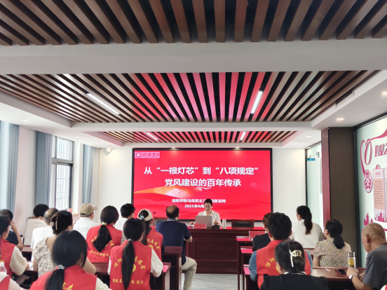 为深入贯彻中央八项规定精神学习教育,推进新时代党的创新理论进社区,切实发挥马克思主义学院思政课教师的理论宣讲优势,提升基层党员干部的纪律意识和作风建设水平。6月12日,我院教师张玉柯副教授应浉河区金牛山街道金湖社区邀请开展主题为“从‘一根灯芯’到‘八项规定’,党风建设的百年传承”的理论宣讲报告。金牛山街道党群服务中心负责人黄忠斌、金湖社区党支部书记付国樊、我院党总支书记陈金强、执行院长朱新荣、总支委员、支部书记以及金湖社区的党员同志参加了此次活动。
