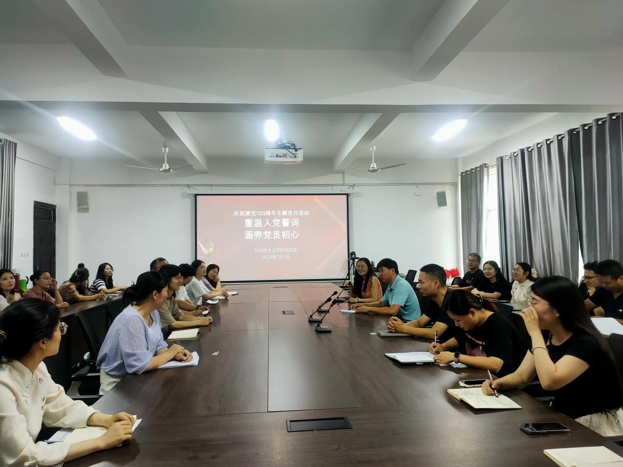 为庆祝中国共产党成立103周年,坚定党员理想信念,增强党性修养。7月1日,院党总支开展“重温入党誓词,涵养党员初心”主题党日活动。活动由第二教工部党支部书记张玉柯主持,党总支副书记陈金强及全体党员参加了活动。
