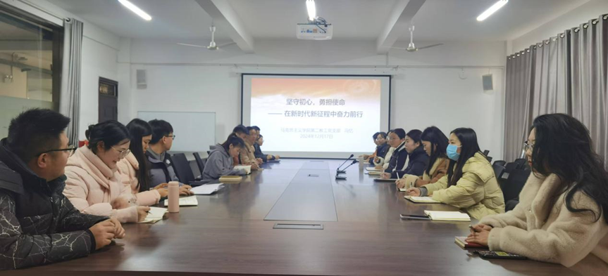 为深入学习习近平新时代中国特色社会主义思想,用党的创新理论武装头脑,增强“四个意识”、坚定 “四个自信”、做到 “两个维护”,确保思政课教师在思想上、政治上、行动上同党中央保持高度一致,思政课教学工作沿着正确的政治方向前进。12月17日,马克思主义学院第二教工党支部在412开展了“坚守初心,勇担使命 —— 在新时代新征程中奋力前行”主题党课学习活动。党课由冯忆主讲,支部全体党员参加了活动。