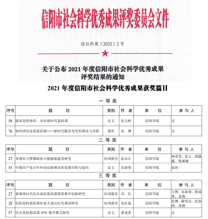 马克思主义学院喜获7项2021年度信阳市社会科学优秀成果奖