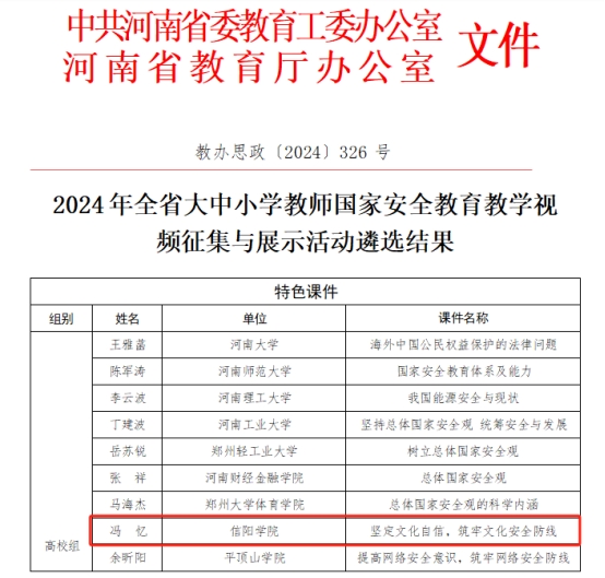 近日,河南省教育厅公布了2024年全省大中小学教师国家安全教育教学视频征集与展示活动遴选结果,全省大中小学教师征集国家安全教育视频311个,经过专家遴选,评选出优秀课件25个,创新课件32个,特色课件54个。我校马克思主义学院冯忆老师的《坚定文化自信,筑牢文化安全防线》视频荣获了特色课件。