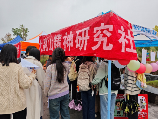 10月12日,信阳学院一年一度的社团招新活动——“百团大战”火热开展,大别山精神研究社的展位布置独具匠心,红色文化元素贯穿始终,从醒目的社旗到精心制作的大别山革命历史展板,无一不吸引着新生们的目光。