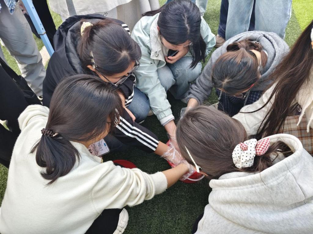 活动中,研究社同学们沉浸式参与四大板块实践:方巾扎染区里,大家自主设计图案,将创意晕染于织物之上;红色书法创作区中,毛笔挥毫间,红色名言的精神力量跃然宣纸;拼接诗会板块,大家以“红旗”“初心”等字词为基,拼缀出饱含红色情感的诗歌;绳子写字项目里,以5—6人为一组协作配合,以绳为笔共同书写红色主题文字,在团队互动中凝聚默契。